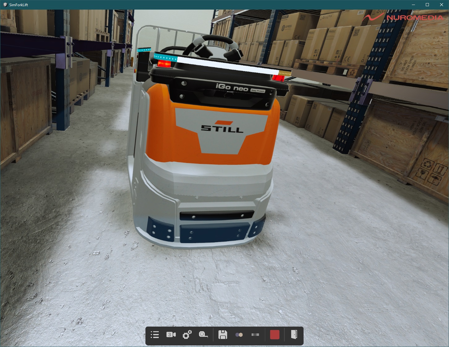 Ich entwickelte zunächst einen VR‑Digitalen Zwilling des STILL‑iGo neo, der über einen PlayStation‑4‑Controller, ein Gaming‑Lenkrad und oder eine an das Fahrzeug angebrachte Eathernet bedient werden konnte. Dieser Ansatz wurde zu einer Testumgebung ausgebaut, in der Nutzer Bremspunkte und Ausweichpfade festlegen und in einer sicheren Umgebung simulieren konnten. Die dabei gesammelten Daten dienen einer KI‑Trainingsreihe, die darauf abzielt, regulatorisch zulässige, aber für Menschen zu unangenehme Maßnahmen (z. B. abruptes Bremsen) zu optimieren. Zusätzlich erstellte ich eine zweite Anwendung, die das gesamte Lagerhaus (inklusive eines Ausstattungseditors) abbildet und synthetische Micro‑Doppler‑Radar‑Daten für das KI‑Training generiert. Diese Anwendung wurde mit einem ROS 2‑Interface ausgestattet, sodass die Simulation multi‑userfähig ist und der iGo neo über MATLAB oder Gazebo gesteuert werden kann. Ziel war es, die trainierten KI‑Modelle in einem sicheren Testumfeld insbesondere bei der Maschinen‑Mensch‑Interaktion zu validieren. Parallel unterstützte ich die Entwicklung der Wegfindungsalgorithmen für das Planungs‑Tool, das die Aufgabenverteilung und den Einsatz der autonomen Gabelstapler plant.